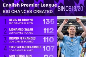 体育资讯11月19日讯 Squawka统计了2019-2020赛季以来球员在英超创造重大机会的次数,并列出榜单,德布劳内、萨拉赫、B费排名前三位。