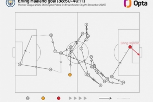 据统计,哈兰德本场首粒进球经过了球队25次传球,曼城上一次在英超通过更多次传递破门还是去年5月罗德里对阵西汉姆的进球(31次)。