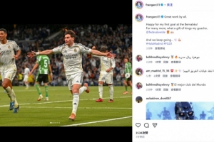 他也在赛后通过社媒晒出自己的庆祝照,并配文:“大家做得太棒了!我很开心收获自己在伯纳乌球场的首球!希望以后还能进更多球,这真是份超棒的圣诞礼物,感谢我的朋友@巴尔韦德🎁🙌🏼继续前进…… 🤍💪🏼”