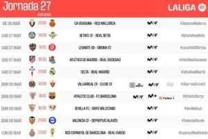 体育资讯2月12日讯 西甲官方公布联赛第27轮各场开球时间,北京时间3月8日凌晨4点皇马客战塞尔塔,9日1点15毕尔巴鄂竞技vs巴萨。