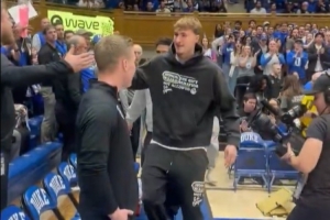 体育资讯2月15日讯 今天,因左脚中足扭伤而缺席了全明星新秀赛的弗拉格回到杜克大学观战,对手为克莱姆森大学。