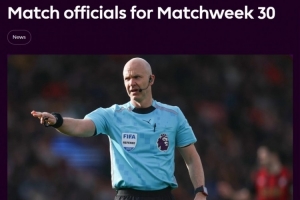 英超第30轮裁判:安东尼·泰勒执法曼联维拉 卡瓦纳执法红军热刺
